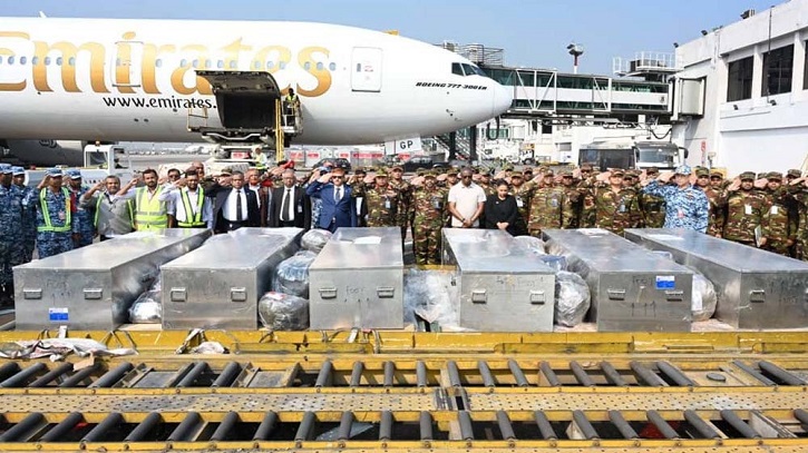 গত শনিবার (২০ ডিসেম্বর) সকালে শহিদ সেনাদের মরদেহ বহনকারী এমিরেটস এয়ারলাইন্সের একটি বিশেষ ফ্লাইট ঢাকার হজরত শাহজালাল আন্তর্জাতিক বিমানবন্দরে অবতরণ করে। এ সময় শান্তিরক্ষীদের মরদেহ গ্রহণ করেন বাংলাদেশ সেনাবাহিনীর চিফ অব জেনারেল স্টাফ লেফটেন্যান্ট জেনারেল মিজানুর রহমান শামীম।
